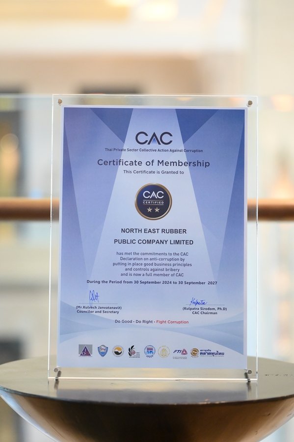 นางสาวณัฐธยาน์ เจษฎาพิสิฐ ผู้ช่วยรองประธานเจ้าหน้าที่บริหารสายงานการตลาดและควบคุมคุณภาพ/ประธานคณะทำงานต่อต้านการทุจริตคอร์รัปชัน บริษัท นอร์ทอีส รับเบอร์ จำกัด (มหาชน) หรือ NER เข้ารับมอบใบประกาศนียบัตรรับรองสมาชิกแนวร่วมต่อต้านคอร์รัปชันของภาคเอกชนไทยในระดับ 2 ดาว สำหรับการดำเนินงานในไตรมาสที่ 1 และ 2 ของปี 2567 จากนายทศพร รัตนมาศทิพย์ กรรมการในคณะกรรมการพิจารณาให้การรับรองของ CAC ให้เกียรติมอบใบประกาศนียบัตรให้แก่บริษัทที่ผ่านการรับรอง ในงาน“CAC Certification Ceremony 2/2024” ภายใต้หัวข้อ “Navigating ESG: The Power of Integrity” ที่จัดขึ้น เมื่อวันที่ 11 พฤศจิกายน 2567 ณ โรงแรมสยามเคมปินสกี้ กรุงเทพฯ