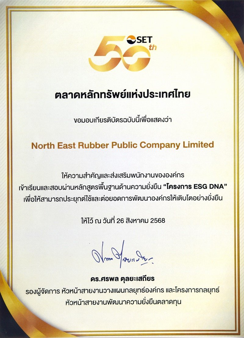 บริษัท นอร์ทอีส รับเบอร์ จำกัด (มหาชน) หรือ NER ได้รับเกียรติบัตร “ESG DNA” จากตลาดหลักทรัพย์แห่งประเทศไทย (SET)
