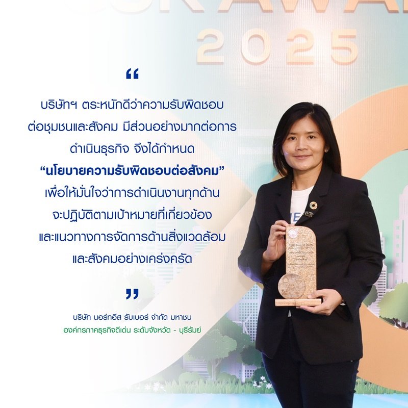 บริษัท นอร์ทอีส รับเบอร์ จำกัด (มหาชน) หรือ NER ผู้ผลิตและจำหน่ายยางแท่ง ยางแผ่นรมควัน ยางผสม เพื่อจำหน่ายไปยังผู้ผลิตในอุตสาหกรรมยานยนต์และกลุ่มผู้ค้าคนกลางทั้งในและต่างประเทศ ได้รับ รางวัล CSR Award 2025 รางวัลองค์กรที่มีผลงานการส่งเสริมความรับผิดชอบต่อสังคมของภาคธุรกิจดีเด่น จังหวัดบุรีรัมย์ ประจำปี 2568