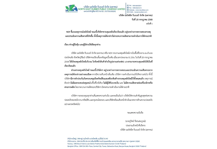 NER ชี้แจงเหตุการณ์เพลิงไหม้ ขณะนี้บริษัทฯควบคุมเพลิงเรียบร้อยแล้ว อยู่ระหว่างการตรวจสอบสาเหตุ และประเมินความเสียหายที่เกิดขึ้น ทั้งนี้เหตุการณ์ดังกล่าวไม่กระทบการผลิตสามารถดําเนินการได้ตามปกติ